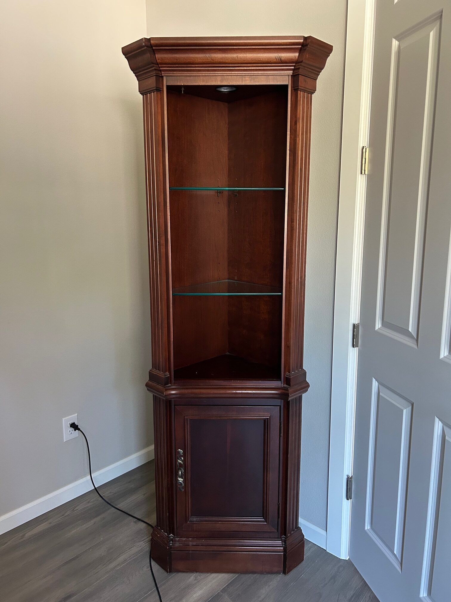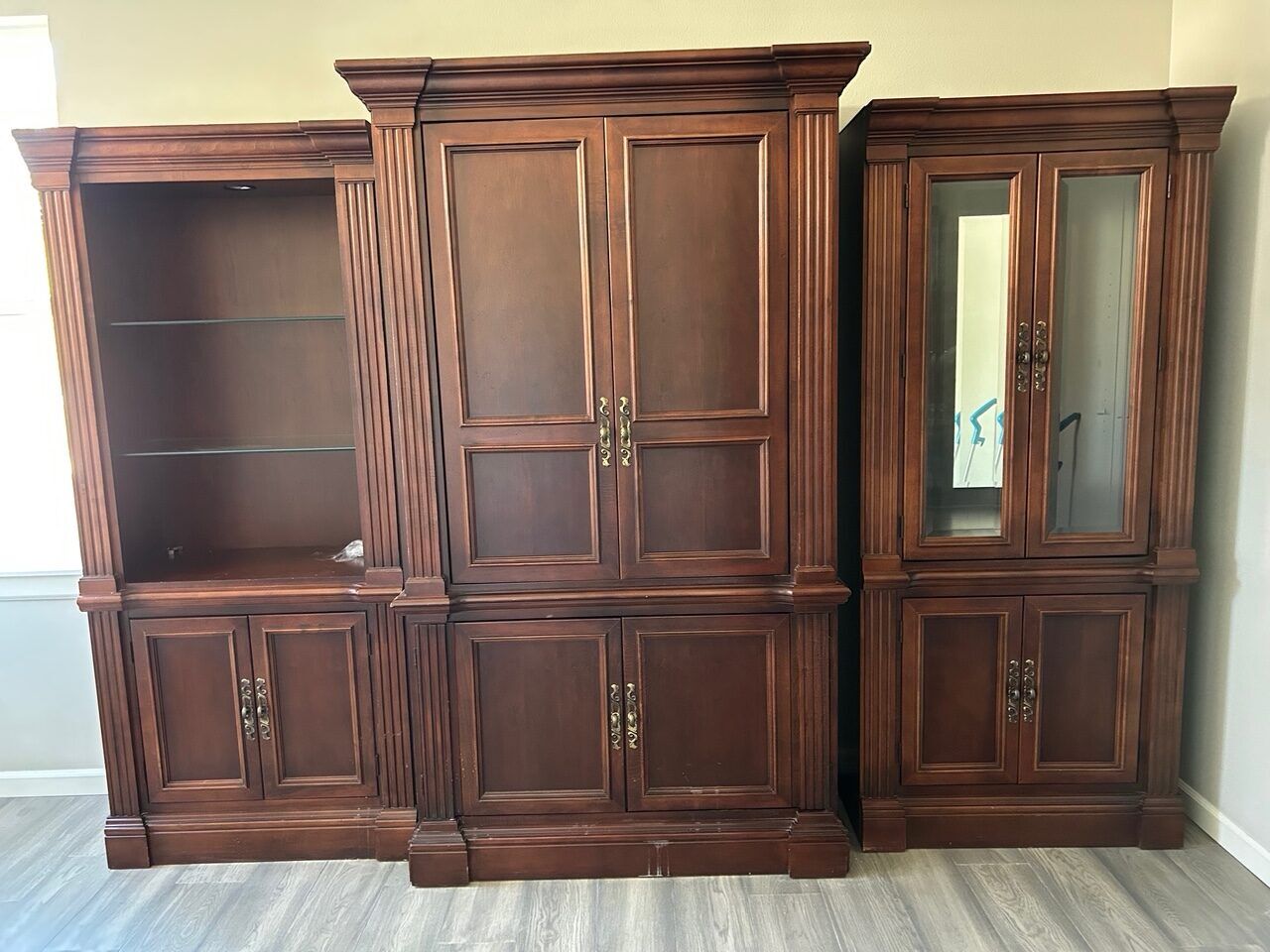 Wall unit that separates into 3 pieces. The main unit is the TV cabinet, and the other 2 are corner hutches. Excellent condition.