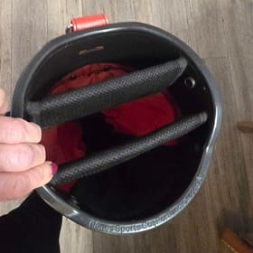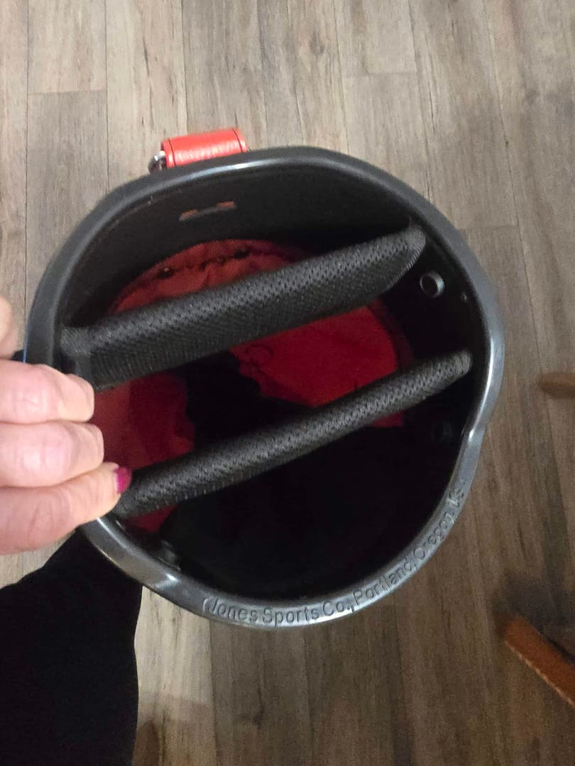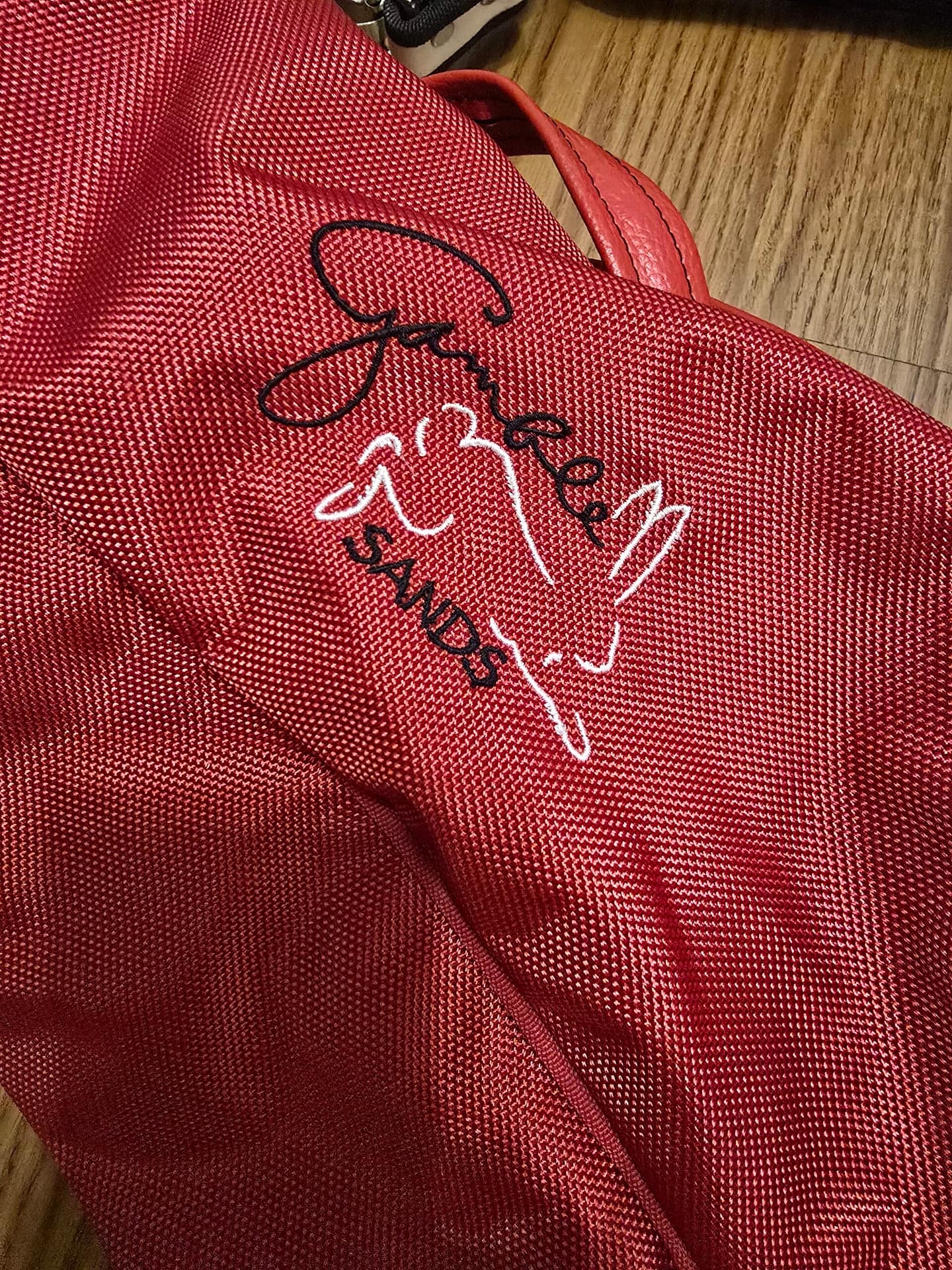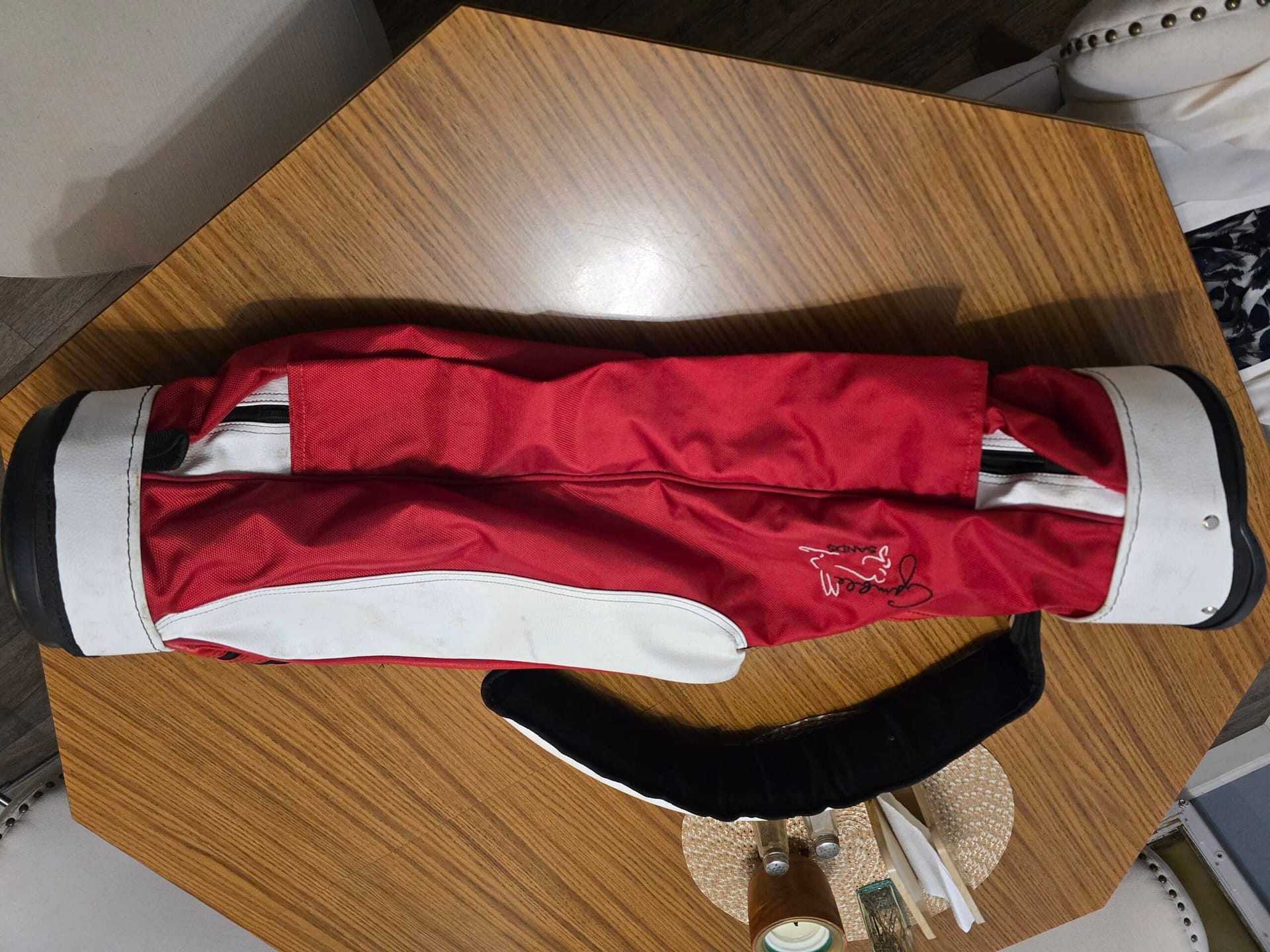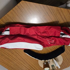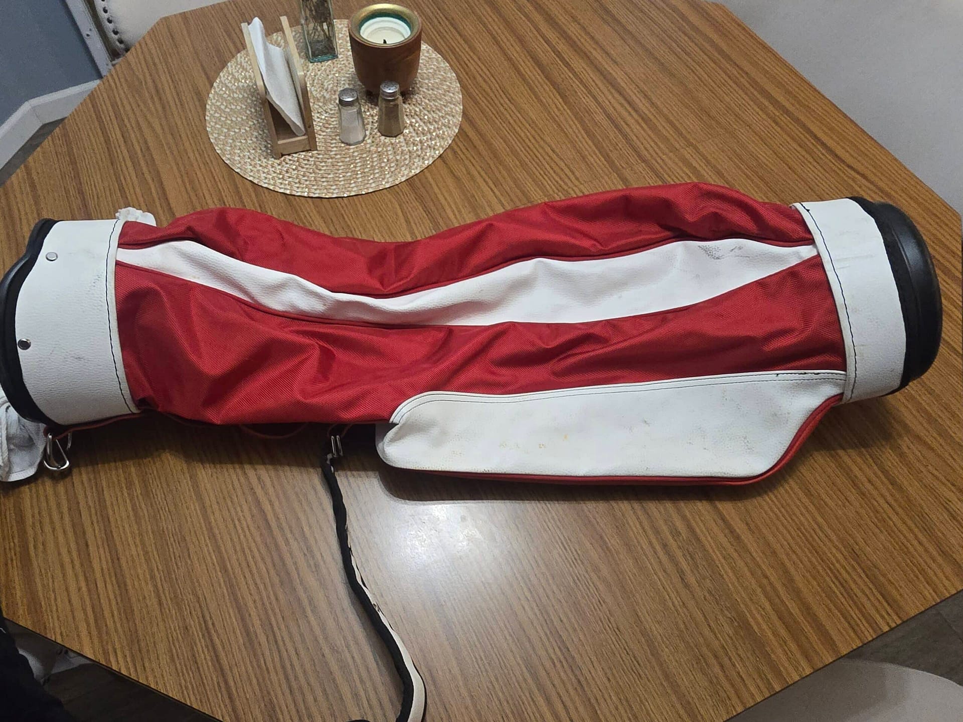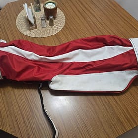 Nice bag with red canvas and white leather. Great condition with some wear and staining on the leather.