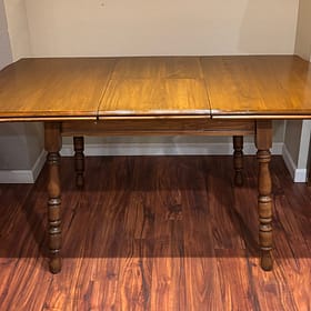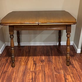 This solid wood dining table is perfect for small spaces. It has a hidden hinged leaf to extend. thtable.