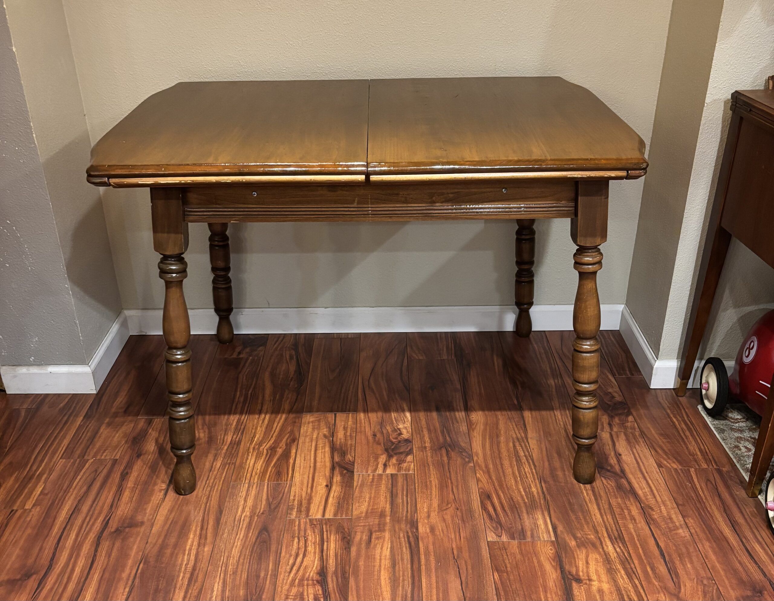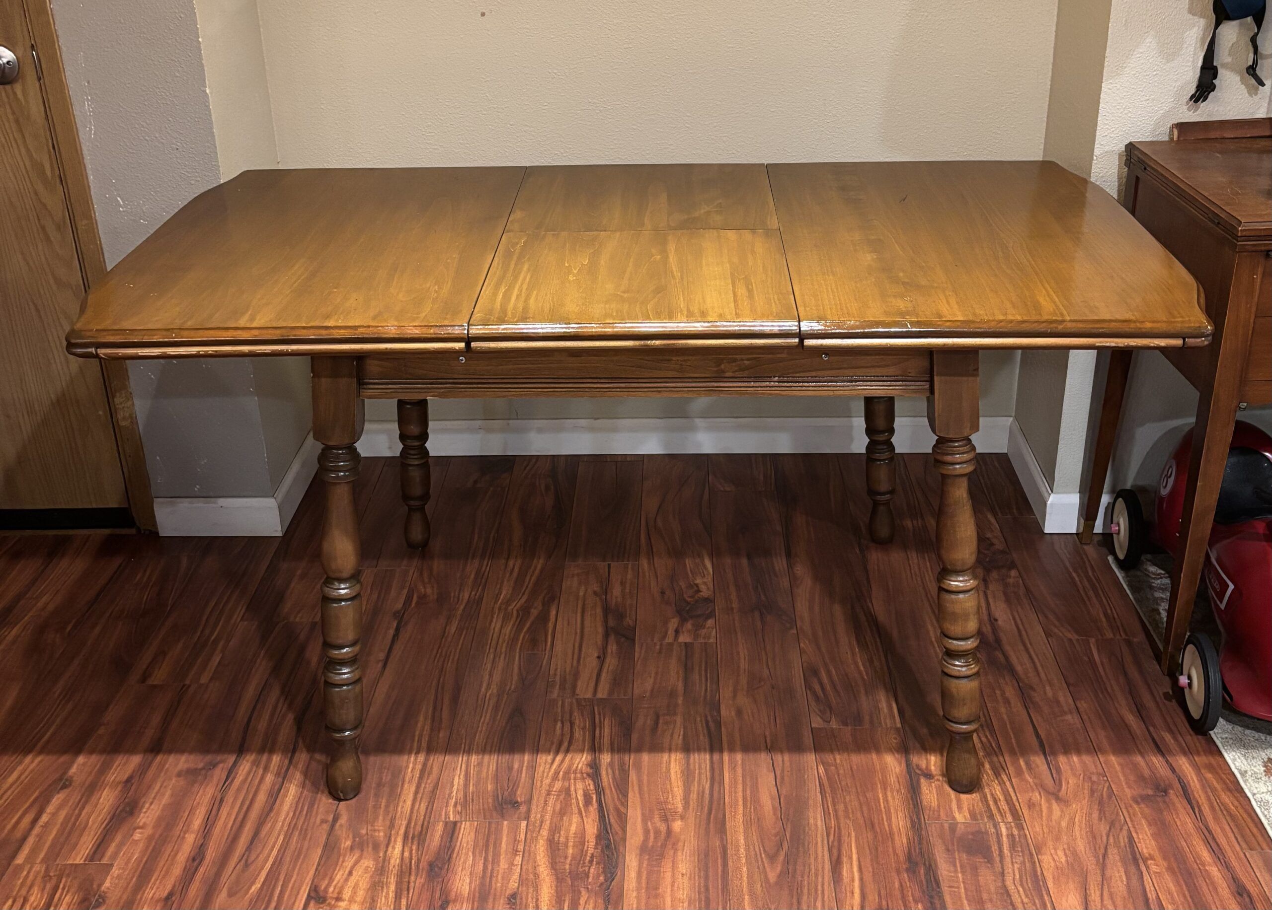 This solid wood dining table is perfect for small spaces. It has a hidden hinged leaf to extend. thtable.